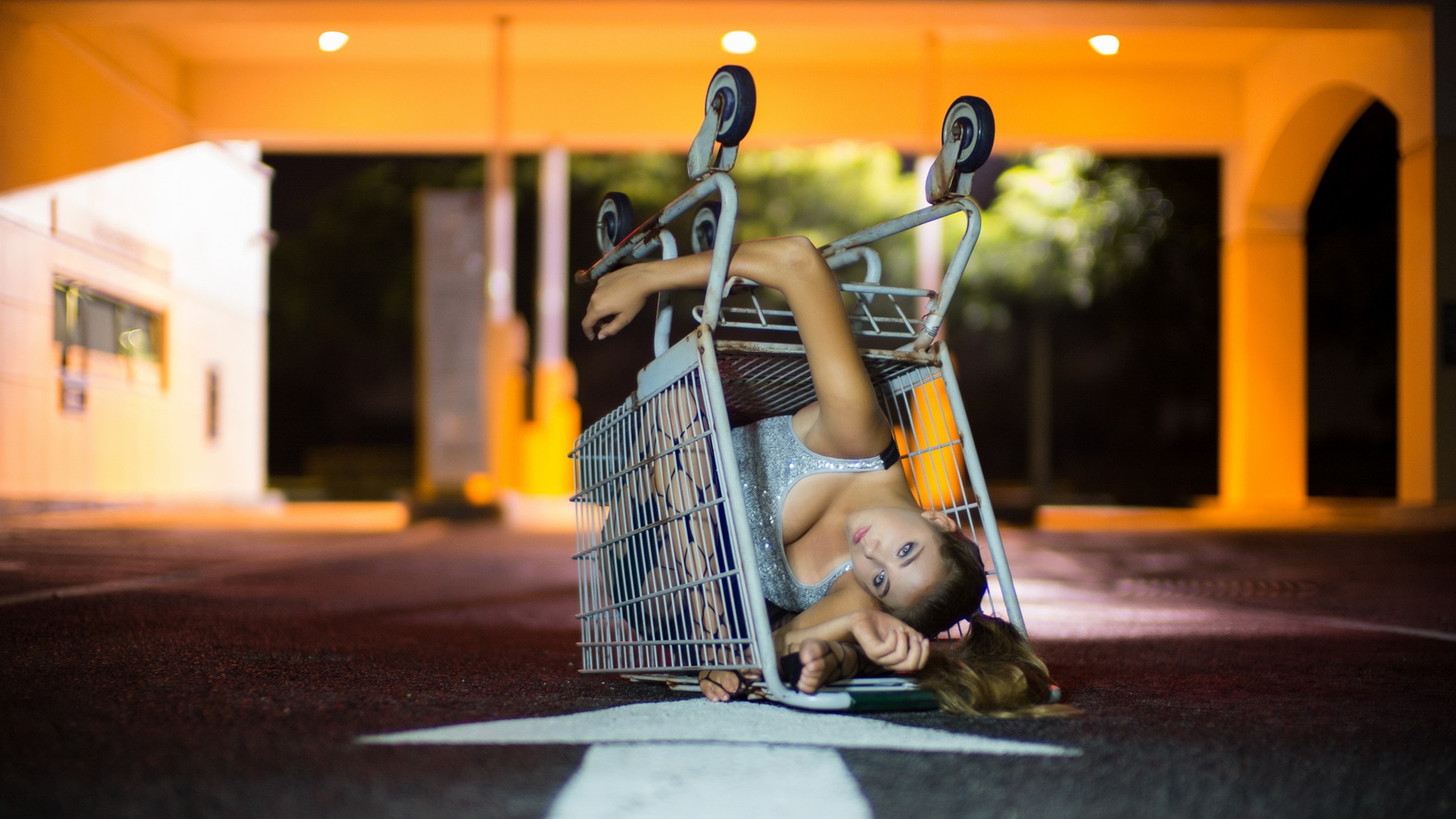 Назад на "на земле лежит женщина с тележкой для покупок"