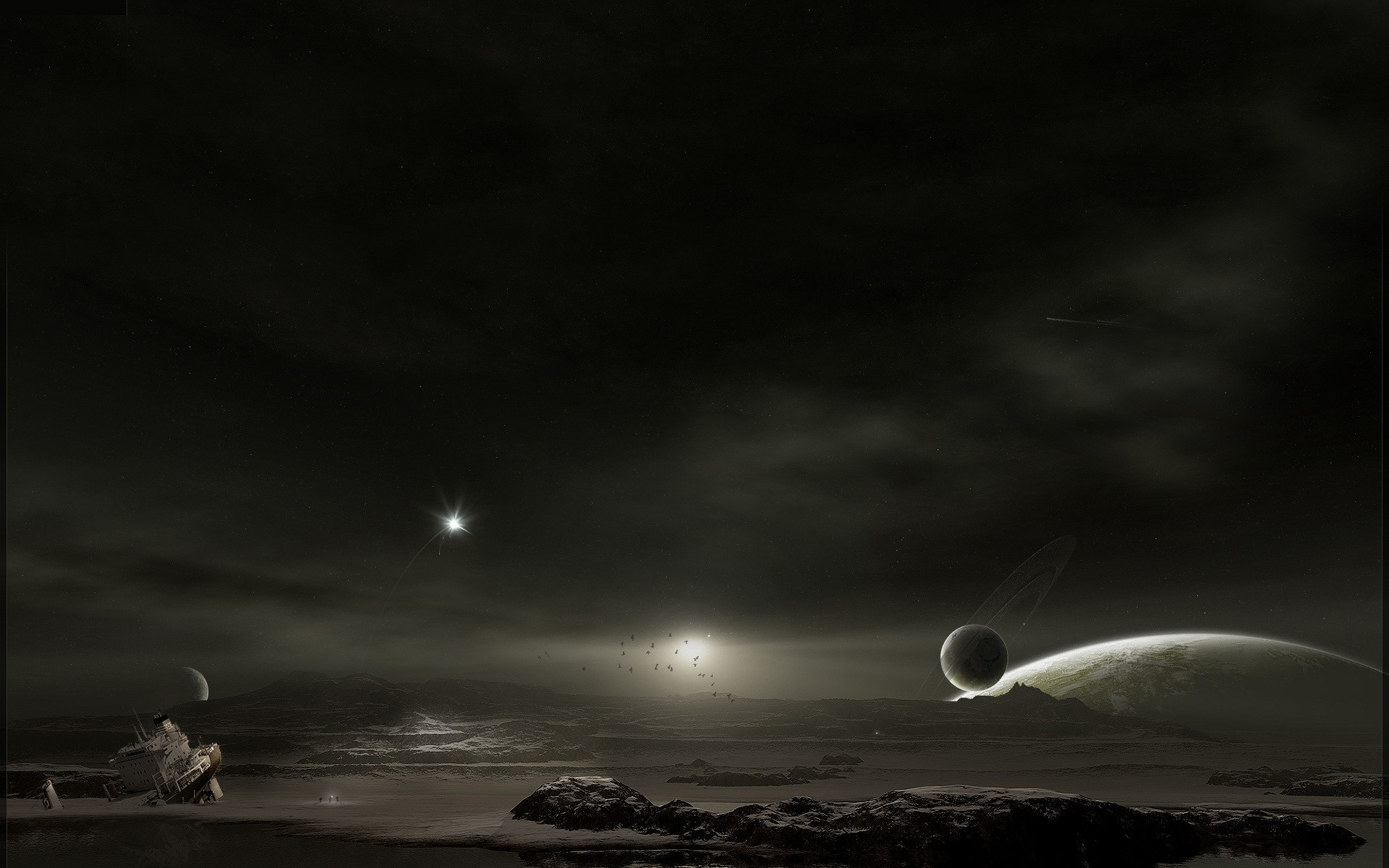 Назад на "человек сидит на скале и смотрит на планету"