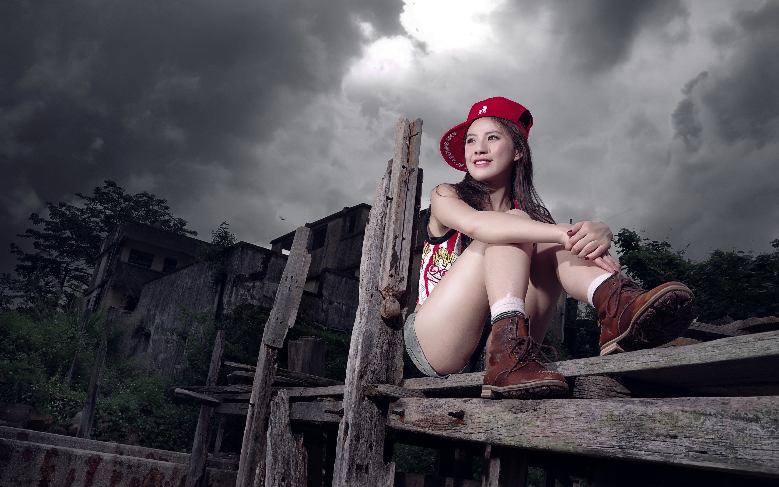 Назад на "женщина, сидящая на деревянном заборе с красной шляпой"