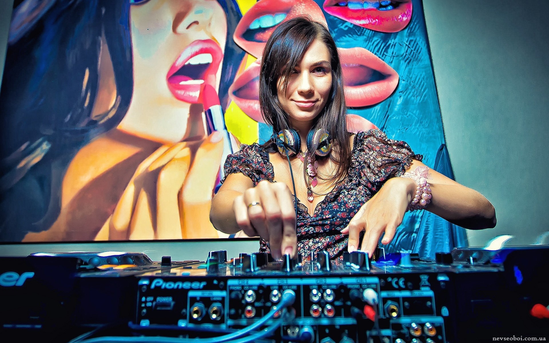 Назад на "женщина в платье, смешивающая музыку на диджейском микшере"