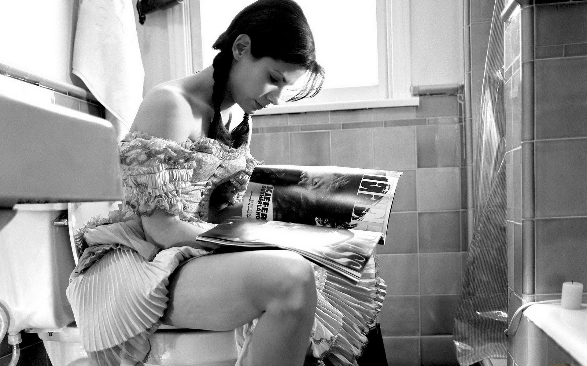 Назад на "женщина, сидящая в туалете и читающая журнал"