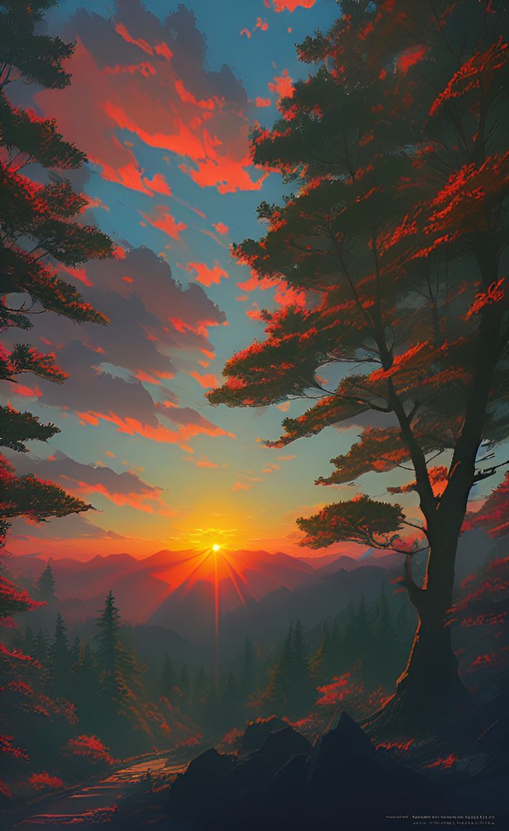 Назад на "картина заката в горах с деревьями и скамейкой"