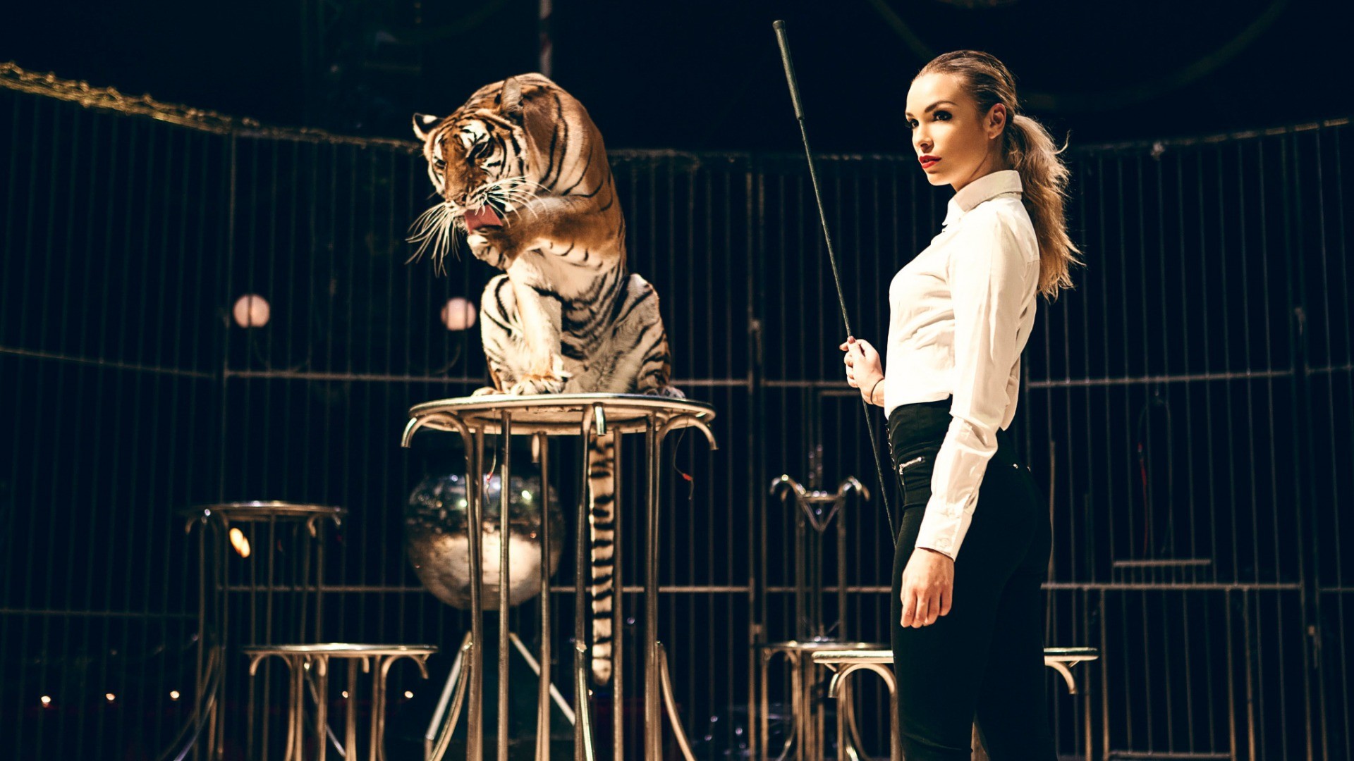 Назад на "женщина стоит рядом с тигром в клетке"