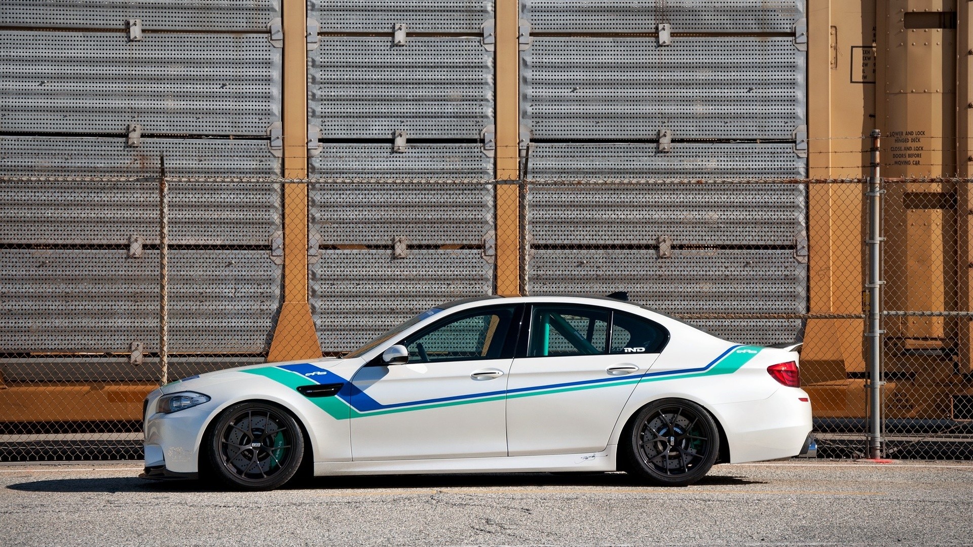 Назад на "арафированная белая машина, припаркованная перед забором с синей и зеленой полосой"