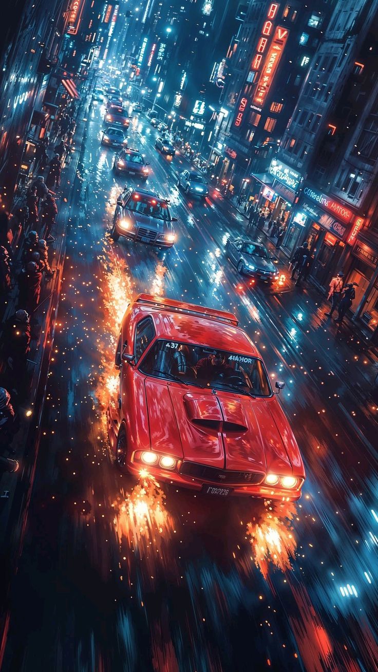 Назад на "автомобили едут по оживленной городской улице ночью с яркими огнями"