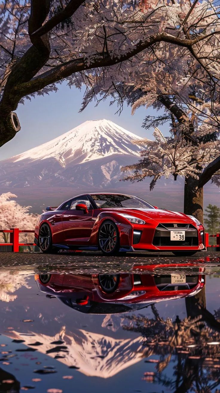 Назад на "красный спортивный автомобиль, припаркованный перед горой с цветами вишни"