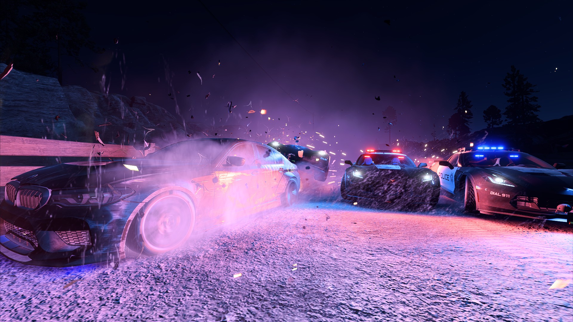 Назад на "автомобили едут по заснеженной дороге ночью с полицейскими машинами"