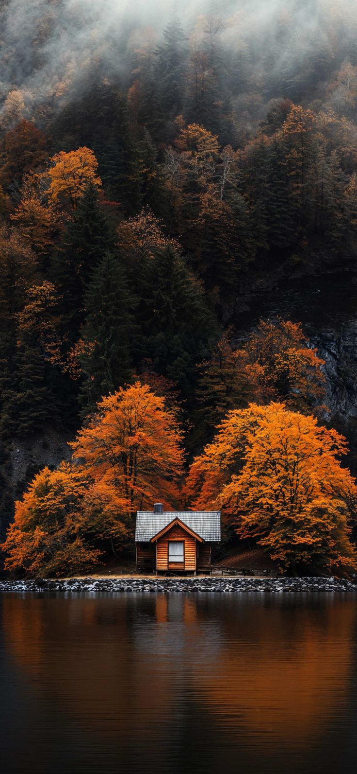 Назад на "деревья находятся на фоне небольшой хижины на озере"