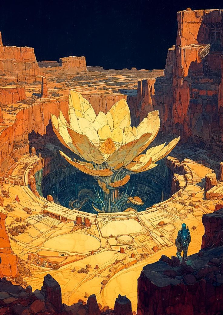 Назад на "картина с изображением гигантского цветка в пустыне и стоящего на заднем плане человека"