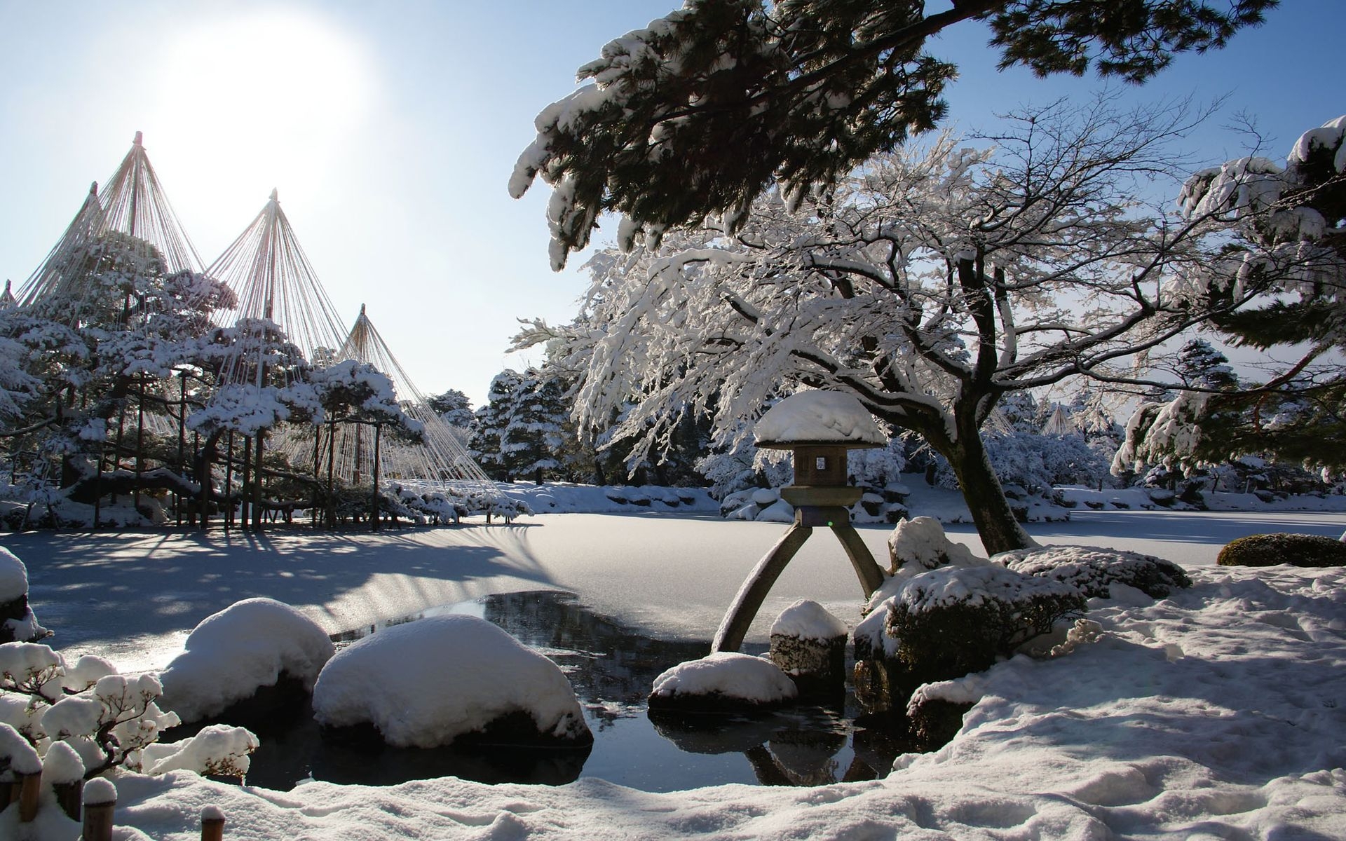 Назад на "снежная сцена пруда и покрытого снегом дерева с птичником"